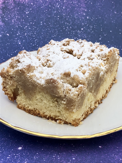 While the dough is proofing, 10-15 minutes before it’s done, you’ll prepare the crumb topping. You’ll think that you have too much topping, however, that is the purpose, to have total and complete coverage. After the cake proofs, take the crumb mixture and form into 1/2-inch pieces and make an even layer over the cake. Bake for approximately 35 minutes or until the cake registers 215° in the center. Loosen the sides of the cake from the dish and transfer to a wire rack to cool. Cut into 12 squares and dust with confectioners’ sugar.