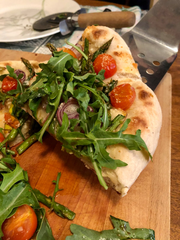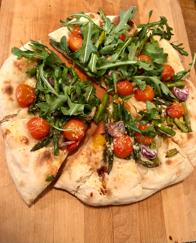 Our local artisanal pizza “joint”, recently had a new pizza on the menu, roasted asparagus, cherry tomato, shaved red onion, shaved pecorino Romano cheese, arugula and a drizzle of balsamic vinegar. I couldn’t resist making it myself at home. This veggie pie was marvelous, sweetness from the roasted asparagus and tomatoes and tanginess from the arugula made for marvelous combination. I also swapped the red onion for shallots, which worked well with the other ingredients.