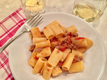 I started chopping my ingredients early in the morning and had it in the crock pot by 8 am.  By the time I returned home, the meat sauce was done. All I had to do was cool it down and refrigerate. I didn't have time to locate fresh pasta noodles such as fettuccine, so I purchased Lidia Bastianich's rigatoni. It was the perfect shape to stand up to this sturdy sauce.