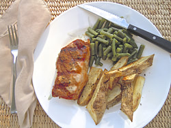 I preheated my gas grill to approximately 350 degrees and grilled each side for a total of approximately 8 minutes, turning the pork a quarter turn to get grill marks on the meat. The results were great! The pork was moist and the rub gave it great flavor. My husband preferred the taste of the Whole Food pork chops to those of Wegmans. To round out the meal I made roasted russet potato wedges, string beans and a salad. Dinner in about 45 minutes.