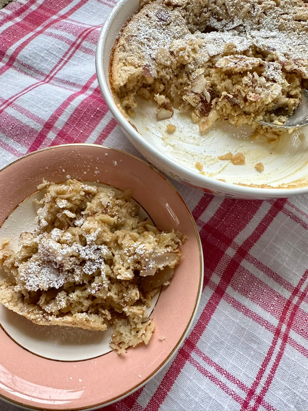 I thought I would try to change up my husband’s baked oatmeal offering. My daughter sent me a link to Almond Croissant Baked Oats from the website “The Happy Pear.” For the recipe you’ll need, old-fashioned oats, almond flour, almond extract, almond milk (I used organic 2% milk), maple syrup, baking powder, plant-based yogurt, pinch of salt, sliced almonds and confectioners’ sugar. The yogurt adds creaminess and works as a binder, however, I used heavy cream that I had on hand.