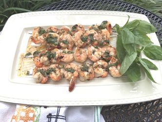 The shrimp are marinated in a quick and easy dressing anywhere from 30 minutes to 2 hours. Once the shrimp have marinated, they are skewered and grilled for 2-1/2 minutes per side. To serve, you drizzle some of the remaining marinade over the shrimp.