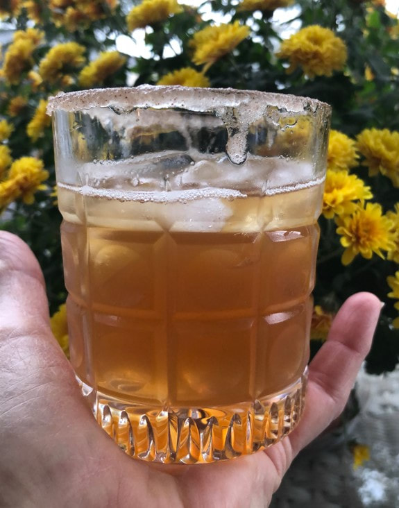 Using a Mason jar filled with some ice, I add the cider, bourbon, maple syrup and shook. I dipped the rim of an old fashion glass into apple cider followed by a dip into a saucer of cinnamon sugar. I strained the cider mixture into an old-fashioned glass filled with some ice and topped with the ginger beer. What a yummy drink. The recipe is well-balanced as far as bourbon to cider and a hint of maple syrup rounds out the flavors. Both my husband and I enjoyed our pre-dinner cocktail.