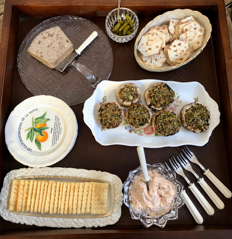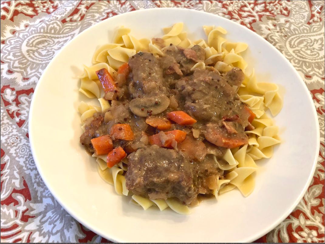 Our neighbor, Jeff, just retired and my husband wanted to have he and his wife over for dinner. This couple has been our neighbor for more than 30 years. What was on the menu you ask? For hors d’oeuvres I made my late cousin’s stuffed mushrooms, crab spread from Mr. Shrimp (Belmar) and Alexian’s Pâté’s Wild Forest Mushroom Pâté served with cornichons. A Stilton and Pear salad was our first course. For dinner, Dijon and Cognac Beef Stew, a recipe from the New York Times, served atop garlic mashed potatoes along with popovers. Dessert was the Financiers that I recently blogged about.