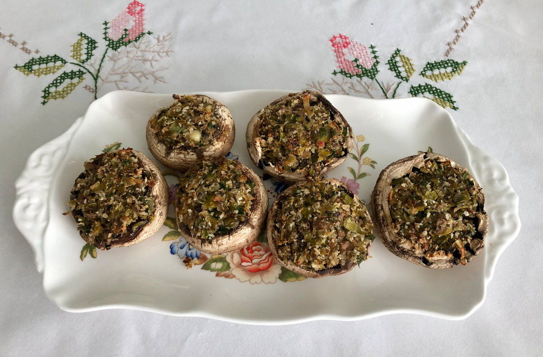 I hadn’t made the stuffed mushrooms in years. Since the stew needed mushrooms, I purchased a few extra. For the recipe you’ll need large white mushrooms, an onion, a clove of fresh garlic, vegetable oil, breadcrumbs, grated cheese (I used Pecorino Romano), fresh parsley, salt and oregano. The mushrooms caps are filled with the cooked chopped stems and the balance of the ingredient list. The filling is pre-cooked before being stuffed into the mushrooms. I used panko breadcrumbs and drizzled some olive oil on top before baking for 25 minutes. The mushrooms were as good as I remember them and they were a hit with our guests.