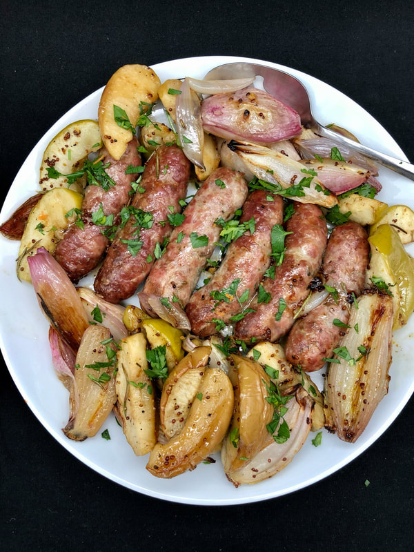 The combination of sausage and squash was delicious. I used Italian sausage with fennel from my Pastosa Ravioli store. After roasting the sausage and squash, a sauce of lemon  juice with chopped parsley, salt and pepper is poured on top. The sauce brightens the flavors of the sausage and squash and makes for an appetizing meal.