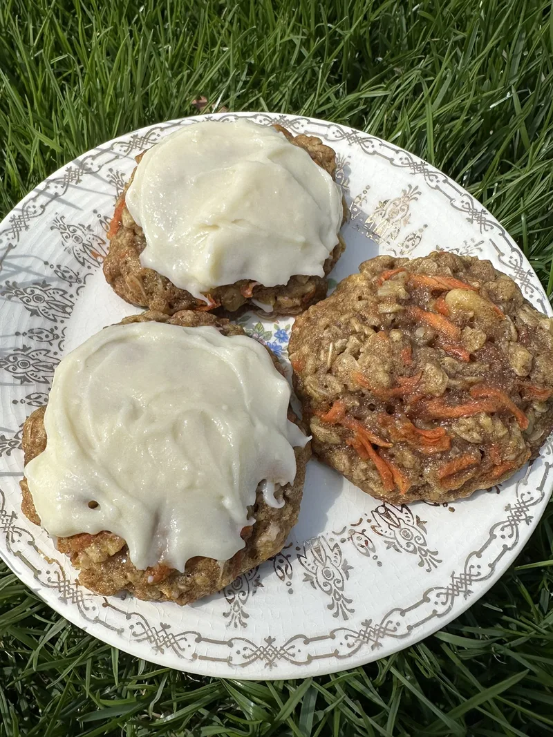 I had some leftover cream cheese frosting after making my granddaughters a few red velvet pancakes. I was thinking of what else I could make to use up the frosting; that’s when I found Carrot Cake Cookies. I looked at several recipes, but wanted to find something that closely resembled my own carrot cake recipe. I found it on the website “Sugar, Spun, Run” by Sam Merritt. Her recipe came close to mine with the exception of a few ingredients. Think of this cookie as an oatmeal cookie with the addition of shredded carrots. The recipe also needs, light brown sugar, granulated sugar, eggs, vanilla, all-purpose flour, baking soda, cinnamon, nutmeg, salt, old-fashioned oats, chopped walnuts (or pecans) and raisins (optional).
