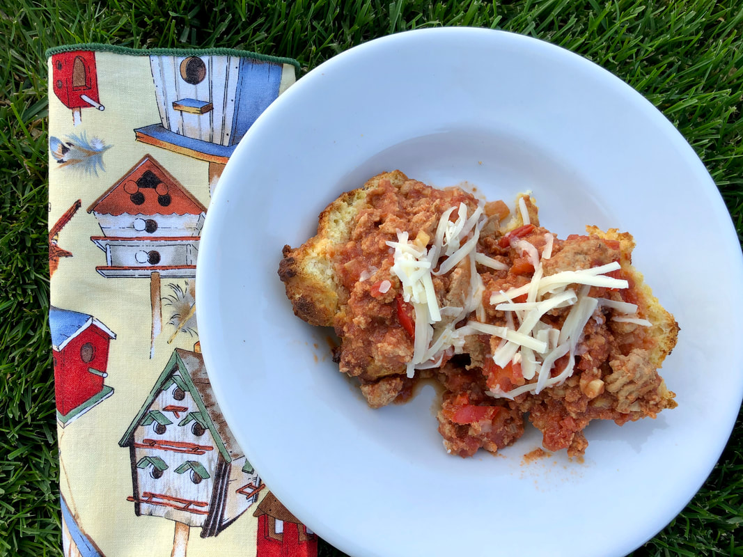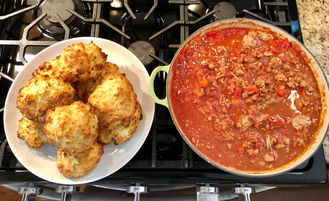 Since my daughter and her family arrived to stay with us during their kitchen renovation, she and I have worked out a weekly menu and food shopping list. I do, however, have a tendency to deviate from the menu, especially if I would rather prepare something else. We had planned on having Michael Chiarello’s turkey polpettone. These are seasoned ground turkey patties filled with mozzarella in the center. When my son-in-law mentioned that he hadn’t had Sloppy Joes in a very long time, I changed the next day meal from turkey polpettone to Turkey Sloppy Joes on Cheddar Buttermilk Biscuits.