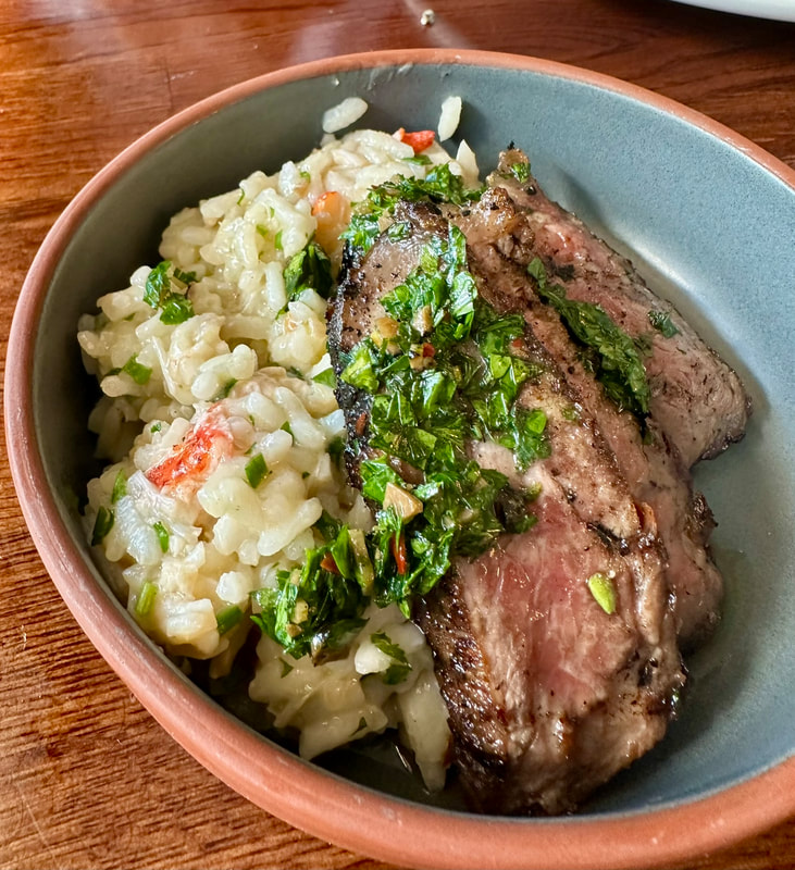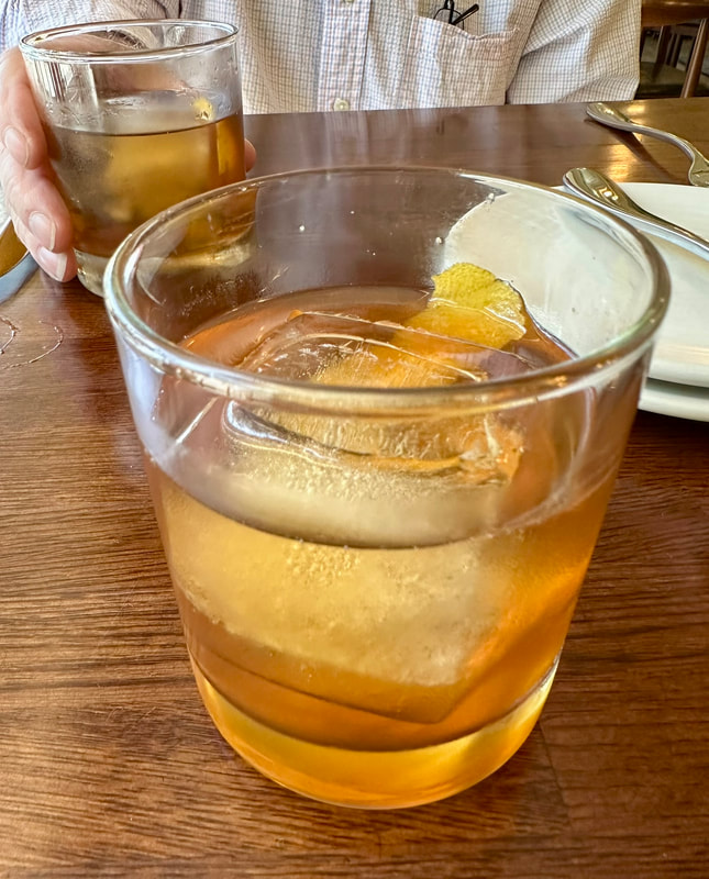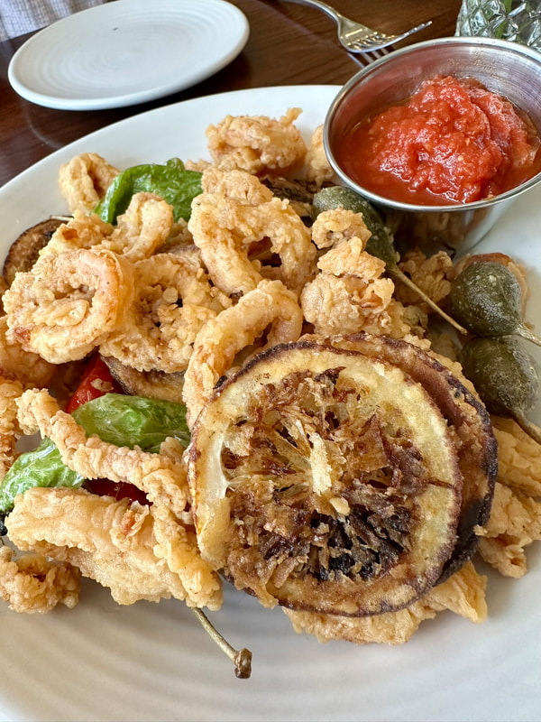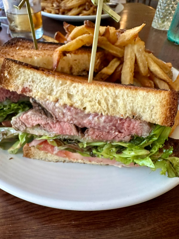 As we were walking into the restaurant we passed chef/owner Laura Brahn and s server as they just finished taking a picture of their nightly special, strip steak over lobster risotto with black truffle carpaccio. I commented that it was too bad it was on the dinner menu. However, started with Calamar Fritti. The tender calamari had a crispy, crunchy exterior that came with shishitos, lemons, caper berries all delicately fried with a side of marinara for dipping. For lunch we ordered the sandwich special which was flank steak melt with aged white cheddar, horseradish Dijon aioli, red onion, lettuce and tomato on brioche bread with fries. What a sandwich! The messy, but delicious, sandwich did not disappoint. The meat was cooked as ordered medium rare for my husband, rare as what the chef prefers for mine. The savory sandwich with tender and moist flank steak had a hint of char flavor, which added another layer of flavor. The cheese and aioli also contributed to the flavor of the steak with the tomato and lettuce offering texture. The overly generous (freshly sliced russet potatoes) fries were divine, enough for two people. Overall, a wonderful lunch. I forgot to mention, to accompany our tasty meal, I suggested to my husband that we have the Rotary Cocktail, delicious and a nice indulgence accompanying a late afternoon lunch.