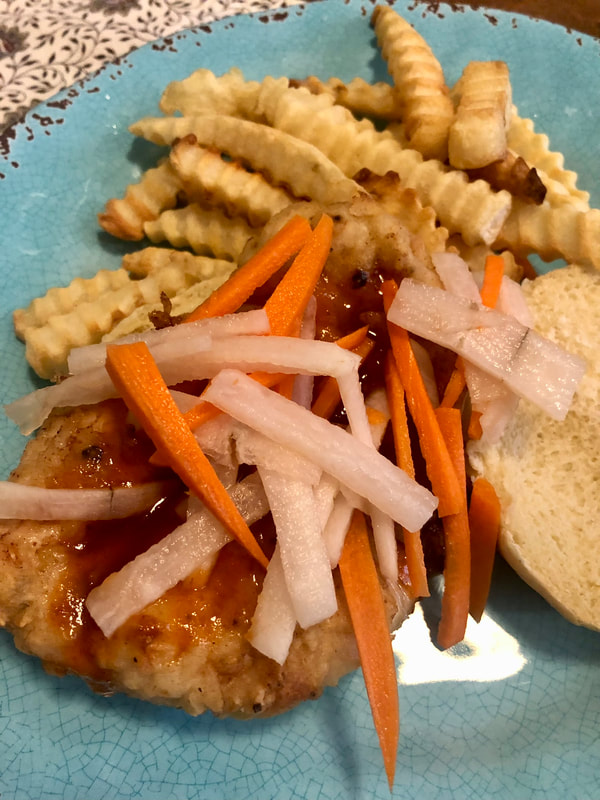 For the carrot-daikon radish slaw, I followed a recipe by David Tanis of The New York Times for Pickled Vegetables. For his recipe I needed one cup each of julienned carrots and daikon, granulated sugar, salt and rice vinegar. For the honey sriracha sauce, a recipe from the website “A Food Lover’s Kitchen” seemed to match well with Hoagitos ingredients. This recipe called for sriracha, honey, salted butter, low sodium soy sauce and lemon juice. Remembering what Terence said in the video, I swapped the lemon juice for lime. To serve, I placed the fried chicken on a brioche roll, topped with the honey sriracha sauce and the slaw.