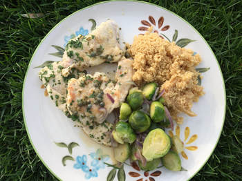 When I returned home, I made a quick visit to www.epicurious.com to find an easy recipe for turkey scaloppini with capers and lemon. The recipe received great reviews and it only took about 25 minutes to make. To add to a stress free supper, I had just enough couscous left in the pantry for a side dish. To jazz this up, I added Williams-Sonoma Organic Vegetable Stock Concentrate to the water for more flavor. For a vegetable, we had Wegmans Special Blends side dish of Petite Brussels Sprouts with red onion in a garlic herb sauce, delicious! The Brussels sprouts retail for $3.99 a package, but occasionally Wegmans will have a $1 off coupon on their app.