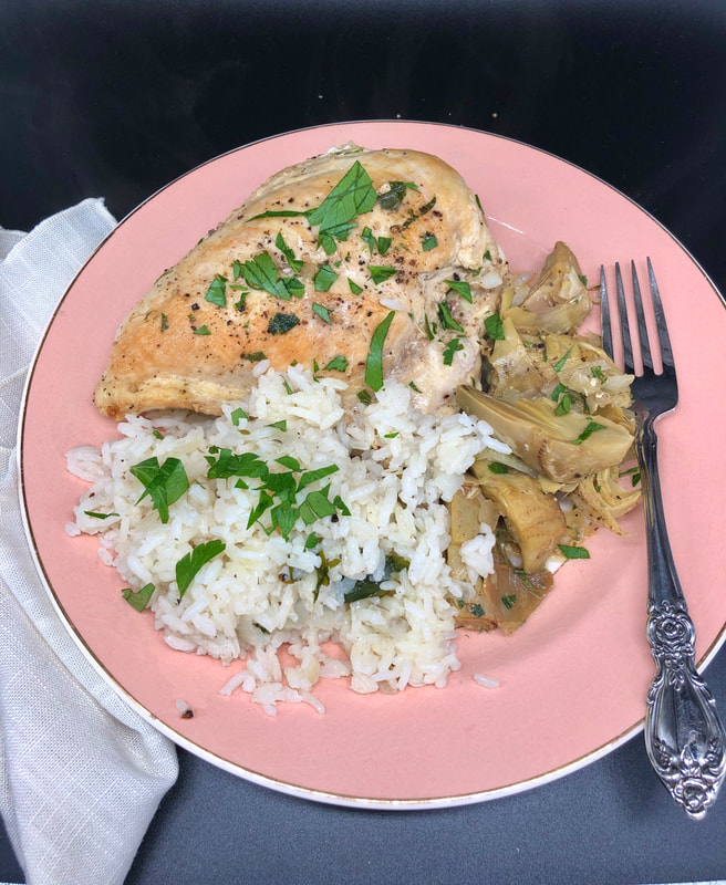 The recipe came together quickly as I didn’t have to go through the cleaning of the artichokes. First I browned the chicken breasts on both sides then set them aside. Next, I sautéed for approximately 5 minutes the onion, garlic, parsley and saffron. Once the onion was translucent, cinnamon was added and incorporated into the ingredients. It released a warm, wonderful aroma. Chicken broth was added to deglaze the pan and then the chicken was returned back to finish cooking. After the chicken, was done, I missed a step. I didn’t thicken the sauce with the chicken removed nor add the lemon juice…ugh! When I went over my list of ingredients to confirm I used them all, minus the step of prepping the artichokes, I didn’t read the part about setting aside a bit of lemon juice. However, despite my shortcoming, we did enjoy this dish. I’m sure the bit of lemon juice would have brightened the flavors.