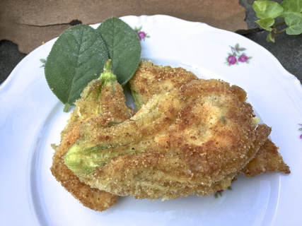 My husband had a pumpkin from last Halloween composting in our small side garden. The result was we had a huge pumpkin plant growing with large leaves, plenty of blossoms, but no sign of pumpkins. My husband picked some blossoms and I decided I would fill them and fry them up for supper one evening.