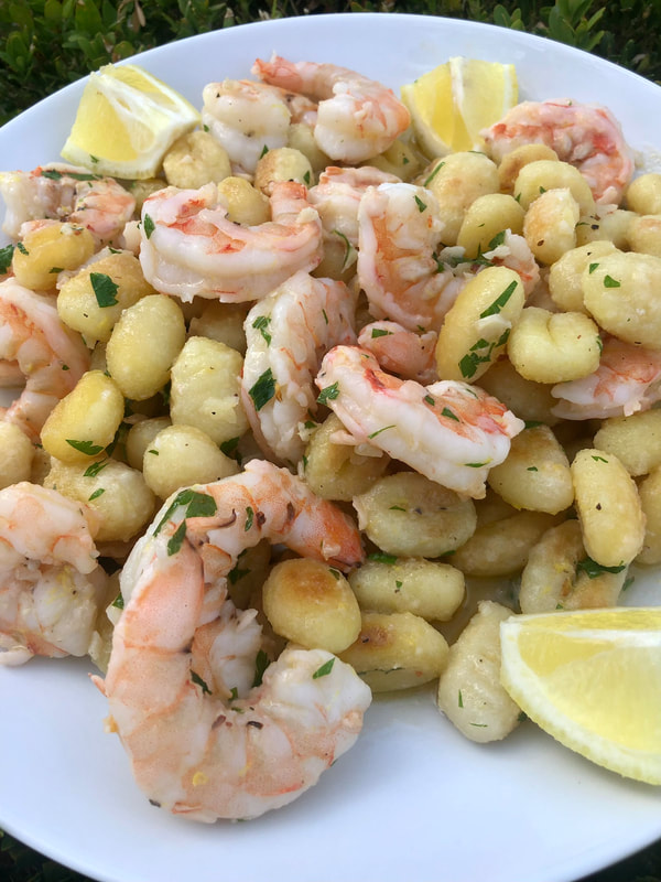 You just got off the beach and the family is hungry. You whip out a large, hopefully non-stick skillet and start heating up the oil. The gnocchi go in the pan and cook until they are golden brown all over. Place them in a dish and melt some butter. Add the garlic and cook until fragrant. You’re on a roll, now add the wine, salt, black pepper and red pepper flakes; cook until reduced. In the home stretch you add the shrimp and sauté until just pink. Add the gnocchi back to the pan and add a bit more salt, lemon zest and parsley. Toss all the ingredients together so everything is well coated. You’re almost there, add some cut lemon and a squeeze of juice from one half and give another toss. Taste to adjust seasoning, pat yourself on the back as dinner is done!