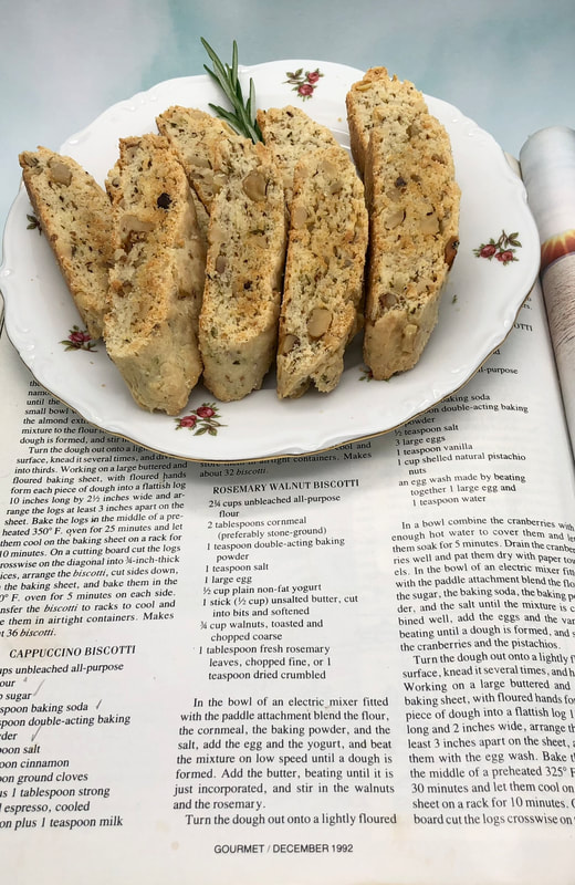 Tomorrow I have an appointment with my orthopedic doctor. When I had my hip replaced, I baked him an assortment of Italian biscotti. He’s not a sweet lover, but did enjoy my Biscotti di Prato. This time I dug out my vintage “Gourmet Magazine,” one of several that survived our Super Storm Sandy basement flood, to make Rosemary Walnut Biscotti. The recipe is from the baking instructor Carol Field, who is known for book "The Italian Baker.