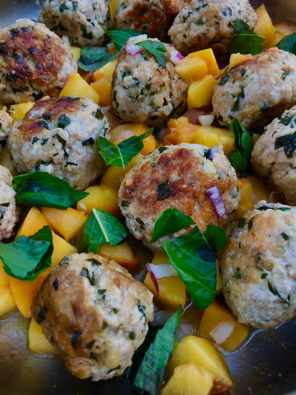 The meatball mix is made with finely grated ginger, minced garlic, cumin, salt, pork, panko and basil. They’re sautéed in a skillet with oil and take approximately 5 to 7 minutes to brown. After browning, you’ll slide the meatballs to the side and deglaze the pan with wine (You may use a white, rosé or red. Depending on your dietary restrictions broth, orange juice or water can be substituted). Once the fond (brown bits on the bottom of pan) have been scraped up, you’ll add the peaches seasoned with salt; then add the wine. The peaches and meatballs simmer until the meatballs are cooked through and the fruit tender. Add the minced onion, a squeeze of lime and adjust seasoning if necessary.