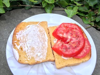 The first of New Jersey tomatoes have arrived at Delicious Orchards in Colts Neck. I had my husband bring several home this weekend. My husband and I prefer white bread, mine lightly toasted, a smear of Hellmans Mayonnaise on both sides and thinly sliced tomato. Season with fresh ground black pepper and sea salt. What is can be better for lunch?