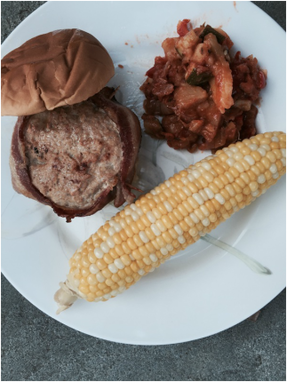 Sunday, I worked until closing so I had to think of something I could prepare ahead of time. On a recent visit to Wegmans, I purchased their family pack of ground turkey (3 lbs. @ $2.99/lb.), which is a great value. I dug out of my recipe box and found another recipe from Better Homes and Garden, but this time from their Test Kitchen Prize Tested Recipes section. The recipe was submitted by Millie Breaux, of Galliano, Louisiana for Cajun Turkey Burgers. These are flavorful burgers and a nice change from beef burgers. The burgers are wrapped in bacon, which add great flavor and makes the turkey stay moist. I served these with some leftover ciambotta and macaroni salad. I purchased some corn earlier in the day at Wegmans (3 for $1), however, it's a bit early yet for summertime corn.