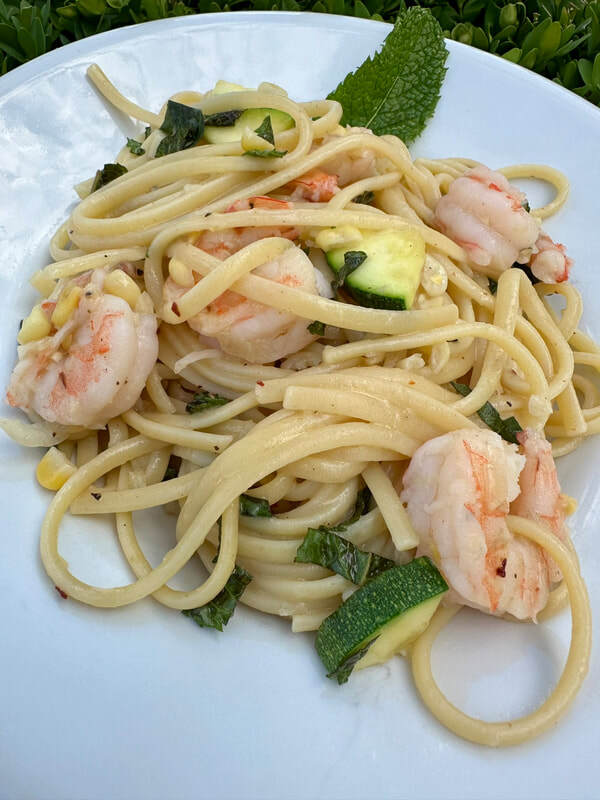 In a recent  CSA box, I had a couple of zucchinis. As my husband is such a pasta lover, I found a recipe by Dan Pelosi on The New York Times/NYT Cooking website for Linguine with Zucchini, Corn and Shrimp. I used blanched and frozen corn kernels from last summer that I had in my freezer along with my North Carolina shrimp from O’Neal’s Sea Harvest.  In addition to the ingredients listed in the recipe title, you’ll also need kosher salt, black pepper, unsalted butter, olive oil, shallot or onion, red pepper flakes, fresh mint for garnish and fresh basil for garnish.