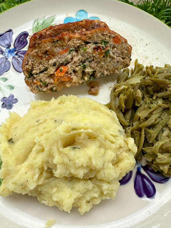 Well, the meat loaf was a hit, to quote my husband, “It’s my new favorite!” The meat loaf was moist, tender and flavorful. The glaze added another dimension to the taste and complemented the meat perfectly. I also served mashed potatoes and string beans from a recipe from High Cotton BBQ in Kitty Hawk, NC. The restaurant was kind enough to share the “no recipe recipe” with me. They use canned string beans that are seasoned with butter, black pepper, and a small amount of garlic salt. Let’s just say theres lots of butter and lots of freshly ground pepper that makes these canned string beans fabulous. In lieu of garlic salt, I used garlic powder and kosher salt.