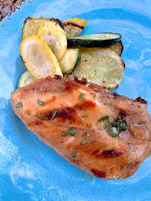 The chicken was bursting with great flavor from the glaze. While I didn't cook the chicken over the squash as the recipe called for, you could hold back a bit of the glaze to toss on the vegetables. This was a great recipe, easy to make and a 30-45 minute recipe if you include making the glaze and slicing some squash. An easy summertime meal, try it!