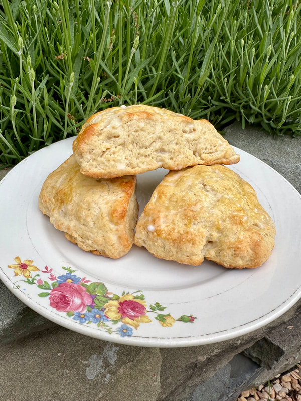 When they were finished baking, I couldn’t wait until they were fully cooled to try them. The scones were tender, had a delicate crumb and a subtle sweetness. However, the one my husband and I tried needed a longer baking time. I put the scones back on the baking sheet and returned to the oven and had them bake a little longer with the residual heat. I suggest baking the scones at 400° and bake for 12 minutes; if possible on parchment paper.