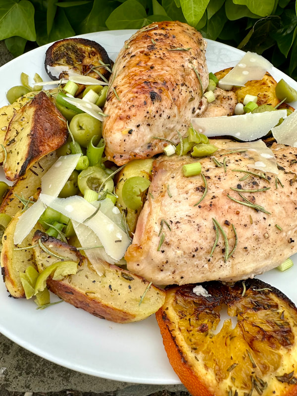 Magazine” for Orange-Rosemary Roast Chicken. For the recipe you’ll need navel oranges, Yukon Gold potatoes, fresh rosemary, olive oil, kosher salt, black pepper, bone-in, skin-on chicken thighs (I substituted bone-in breasts), white balsamic vinegar, honey, Kalamata and Castelvetrano olives, scallions and shaved Parmigiano-Reggiano cheese.