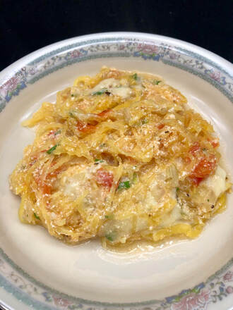 Combine the squash strands and the rest of the ingredients. Pour into a buttered 2-quart casserole dish. Top with lots of grated Parmesan. Bake at 375°, uncovered for approximately 40 minutes or until it bubbles.