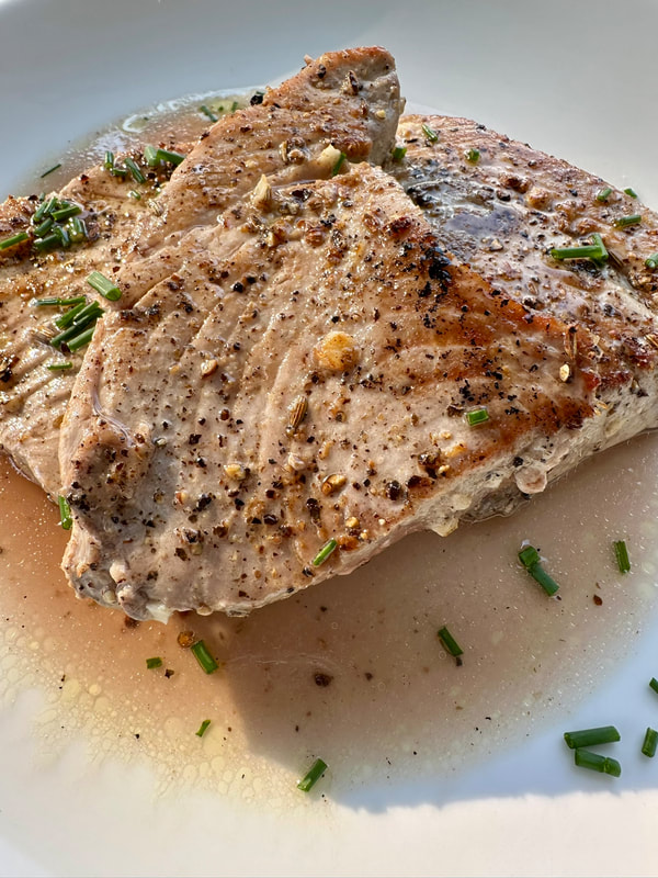 My neighbor’s brother-in-law was fishing earlier in the week and caught tuna off the Jersey coast. I asked my son what species this could be and he said that bluefin are running inshore and can be caught anywhere from a mile to 100 miles out. For the one pound of filets that he gave me, I found a great recipe by David Tanis’ for Tuna au Poivre with Red Wine Sauce. It was perfect for a hot, humid evening. For the recipe you’ll need salt, fresh garlic, coriander seeds, fennel seeds, coarsely crushed black peppercorns, olive oil, butter, shallots, red wine and chicken broth.