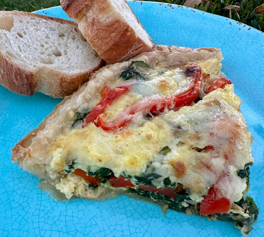 What a wonderful quiche. I served it as a light supper one evening along with a salad. The quiche was creamy and the combination of sweet red peppers with the spinach made for a very flavorful filling.