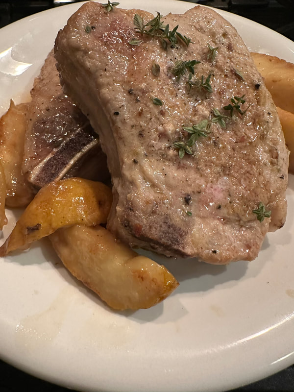 The last recipe I made was Skillet Pork Chops with Caramelized Pears. This recipe is from the October 2024 issue of “Southern Living Magazine.” While pork with apples is a wonderful combination, pears with pork sounded interesting. For the recipe you’ll need bone-in center cut pork chops, kosher salt, black pepper, ground fennel seeds, olive oil, Anjou pears, chicken stock, maple syrup, apple cider vinegar, stone-ground mustard and fresh thyme leaves. Instead of an Anjou pear, I had a French butter pear left from another recipe, that was a tad overripe.