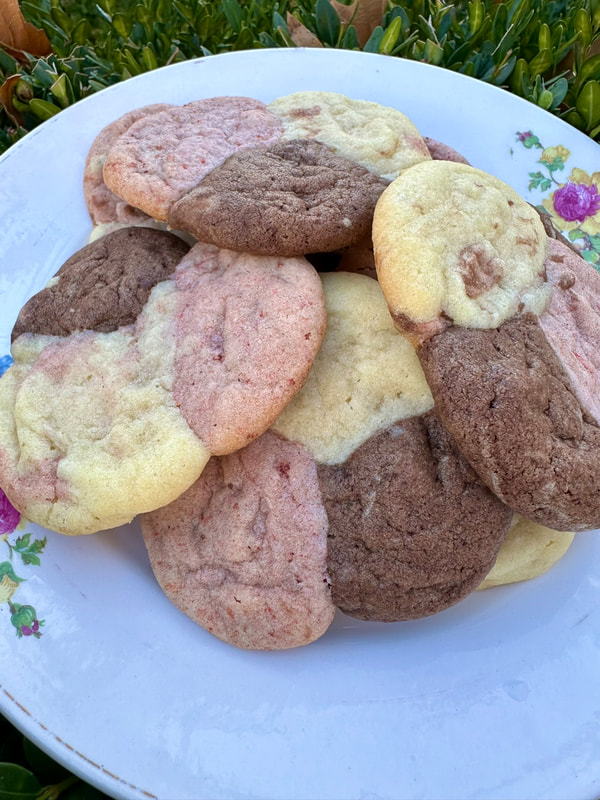 The cookies puffed up nicely and were slightly golden on the bottom. The texture was soft and not overly sweet. The only downside was when eating the cookie, each flavor would break apart. Other than that, the cookie had the appearance I was after as well as the taste. Next time, I may just use my cookie scoop and grab a bit of each flavor thereby making a more cohesive dough ball.