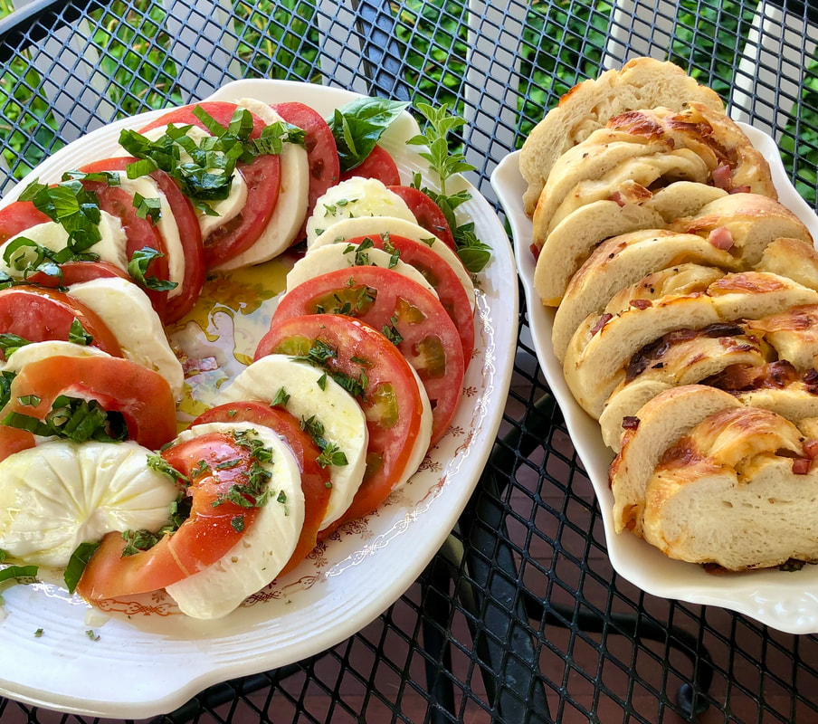 I sliced the tomatoes and mozzarella and drizzled on extra-virgin olive oil. On half of the platter, I added a chiffonade of fresh basil and on the other, chopped fresh oregano. I had just listened to a food podcast when the guest mentioned a friend in Italy recently posted the same dish on social media, but used oregano. I gave it a try and it was wonderful. The earthy, minty notes was pleasantly intriguing versus the savory, peppery taste of basil. The prosciutto bread was scrumptious. It had lots of diced prosciutto throughout, moist and tender crumb. An absolutely wonderful lunch.