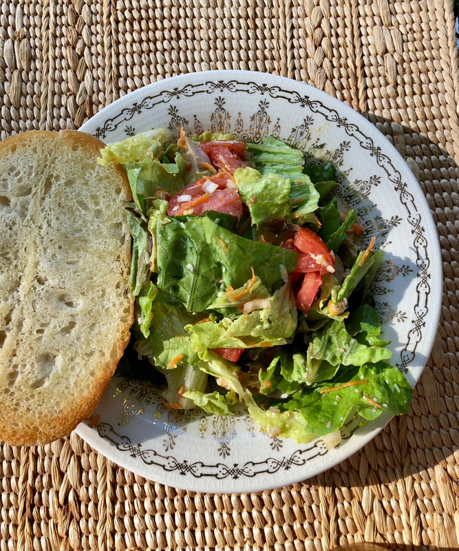 On another warm day, I prepared a salad for dinner. Earlier that week, I made Grilled Chicken Dijonnaise boneless cutlets for my husband’s lunch. I chopped two and added them to a tossed green salad with lettuce from my Dreyer Farms CSA box, along with chopped tomatoes, coarsely grated cheddar cheese and dressed with Garlic Scape Dressing from the garlic scapes from an earlier CSA box. I toasted Italian bread to round out a tasty supper…yum!