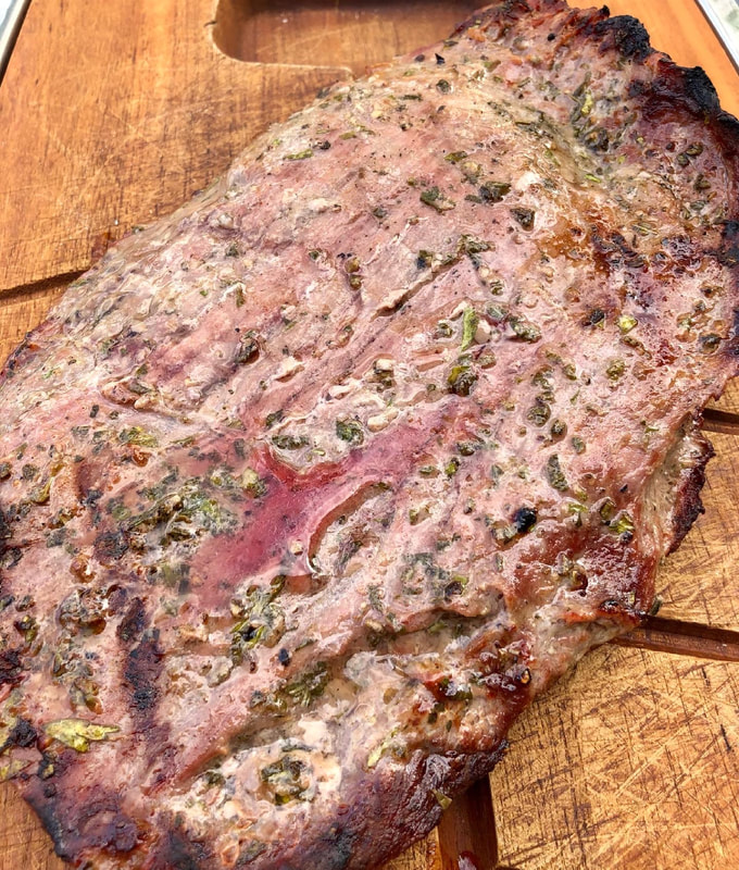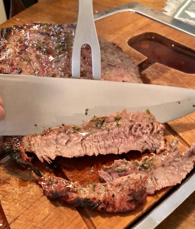 The combination of oregano and rosemary was aromatic and a bit bold. The parsley gave the marinade some freshness. The vinegar and Worcestershire sauce boosted the flavors and added sweet and savory notes that played off spiciness of the Dijon mustard. I grilled the steak approximately 6 minutes per side, which was perfect. The steak was rare in the center, yet tender. After a brief rest, it was time to slice the meat.