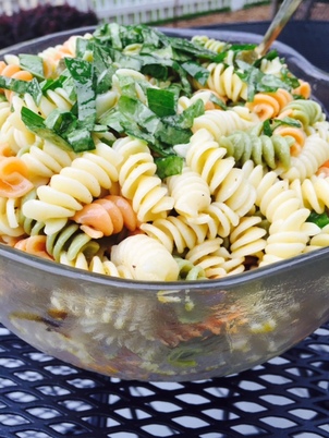 I apologize for the delay, but here is the recipe for the pasta salad. I purchase Barilla tricolored fusilli, which comes in 12 oz.  boxes. For this weekend, I've made a double batch. Also, I roast my own peppers. Now you can either roast the peppers over the gas flame of your stove or under the broiler, but I prefer to roast them outside on my gas grill.