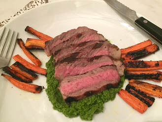 4. Slice steaks and salt cut sides lightly. Spread sauce over center of each plate and fan out sliced steak over sauce. Serve immediately with roasted carrots alongside meat.
