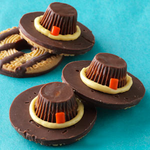 There were some cute desserts here today today. It looks like they someone used mini Nutter Butter Bites, some white frosting, a Hershey Kiss and a chocolate chip to create mini acorns. Another dessert had a frosted fudge cookie turned upside down and a mini Reese's peanut butter cup attached to create a pilgrim hat. I found both the photos and recipe at the Taste of Home ​webpage. The photos are from Taste of Home.