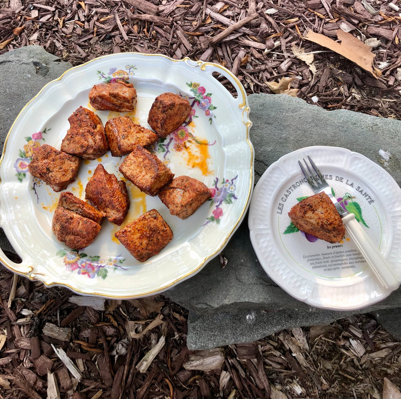 Another evening a neighbor was gifted a fresh tuna filet. What to do? My husband suggested Blackened Tuna Bites. Off to my local food store where I found Cajun’s Choice Blackened Seasonings. I lightly coated the tuna bites with a bit of canola oil and then added the blackening seasoning. A quick sauté in a non-stick skillet and, a voilà quick appetizer, delish!