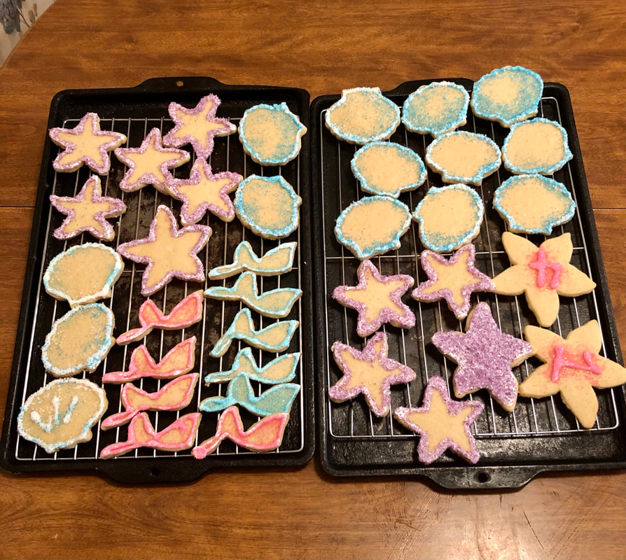My daughter found cookie cutters in the form of a mermaid’s tail, two sizes of star fish and scallop. I made royal icing to outline the cookies then decorated them with colored sugar. The kids had fun both decorating and eating the cookies. The adults enjoyed the cookies too!