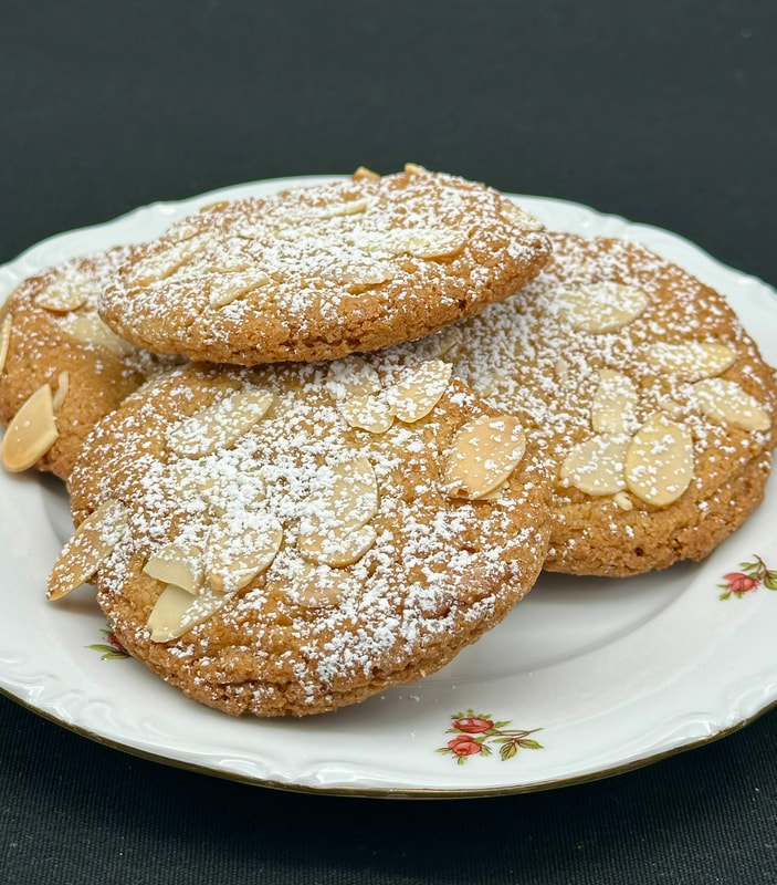 In one bowl you’ll add the flours, baking powder, salt and baking soda. In another bowl the brown sugar, melted butter and granulated sugar are combined. The eggs and extracts are whisked in then the flour is added and combined until there are no dry streaks. This will be a soft dough. Place the sliced almonds in a small bowl. While the recipe called for a 3-tablespoon spring-loaded scoop, I opted to use a #40 cookie scoop (approximately 1.6 tablespoons) as I didn’t want a large cookie. I carefully placed the dough ball  in the bowl of sliced almonds and delicately pressed the almonds on. They were then placed on a parchment lined baking sheet and chilled in the refrigerator for 45 minutes to an hour. The cookies were placed on a baking sheet and baked for 17 minutes. If you’re making them larger, it could take up to 20 minutes. However, I found after baking and cooling on the pan for 10 minutes,  my smaller cookies should have went for less time as they could have been chewier. However, this didn’t deter us from enjoying the cookies as they were fabulous.
