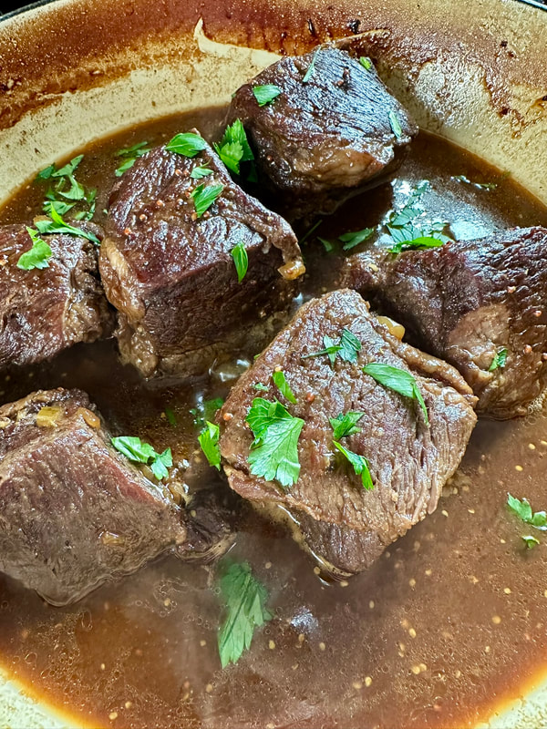 Another memorable meal from this past week was found in “Southern Living Magazine,” Bourbon-Braised Short Ribs. I hadn’t made short ribs in a while and this recipe called to me, or perhaps it was the bourbon. Besides the short ribs and bourbon for this recipe, you’ll need kosher salt, black pepper, a neutral oil, yellow onion, celery, fresh garlic, dried bay leaves, tomato paste, beef broth, molasses, Worcestershire sauce, whole-grain mustard, and fresh parsley.