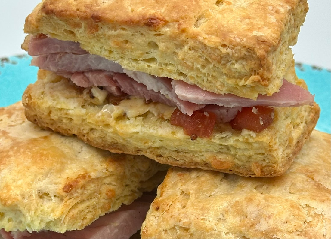 7. Assemble: Split each biscuit in half. Spread a bit of the tomato chutney–mustard butter on cut sides. Layer the bottom half of each biscuit with ham and top with other biscuit half. To reheat before a party, loosely wrap the assembled biscuits in foil and then place them in a 350°F oven for 5 to 8 minutes.