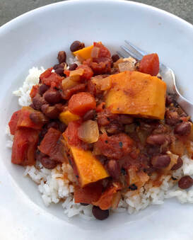 One of the comments left by a cook questioned the need for both onion and garlic powders when you’re already using fresh. I decided to eliminate the powders. A good suggestion was to peel the sweet potatoes as the skin sometimes comes away from the potato. The recipe creator also suggests sweet winter squash (butternut or kabocha) in place of the potatoes.