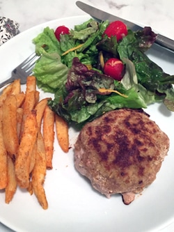 These turkey patties are, do I dare say refreshing. Perhaps it's the addition of fresh sage, lemon zest and the green onion that give it that taste. In the center of each patty is a piece of mozzarella. In under 30 minutes you have a heart healthy, delicious meal on the table. My husband just wanted a salad to round out the meal. To keep on the heart healthy track, I prepared homemade balsamic vinegrette, another recipe from Gourmet Magazine, June 1994.