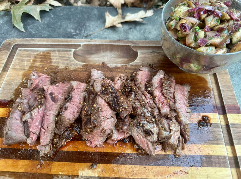 Once my grill was heated, the steak was cooked over medium-high heat for approximately 4 to 5 minutes per side for medium-rare. To serve, slice against the grain and top with the eggplant chutney. What another terrific preparation for skirt steak. The chutney was a lovely accompaniment to the steak which was perfectly cooked. The cumin gave the chutney a depth of flavor and slight spiciness. The coriander pairs well with the cumin and offers a floral note. The mustard seeds offered undertones of heat to the chutney. Overall, a delicious preparation.