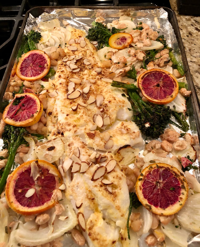 This sheet pan meal starts by blending mayonnaise, red pepper flakes, minced garlic, orange zest and salt in a bowl. The mixture is spread over the fish. The fish is surrounded by the balance of the ingredients and is broiled under high for 5 minutes. A sprinkle of sliced almonds on top and a then quickly toasted for another minute under the broiler. To make sure all the vegetables were thoroughly heated, I turned off the broiler and turned the oven to 375° gave the dish another 5-10 minutes.