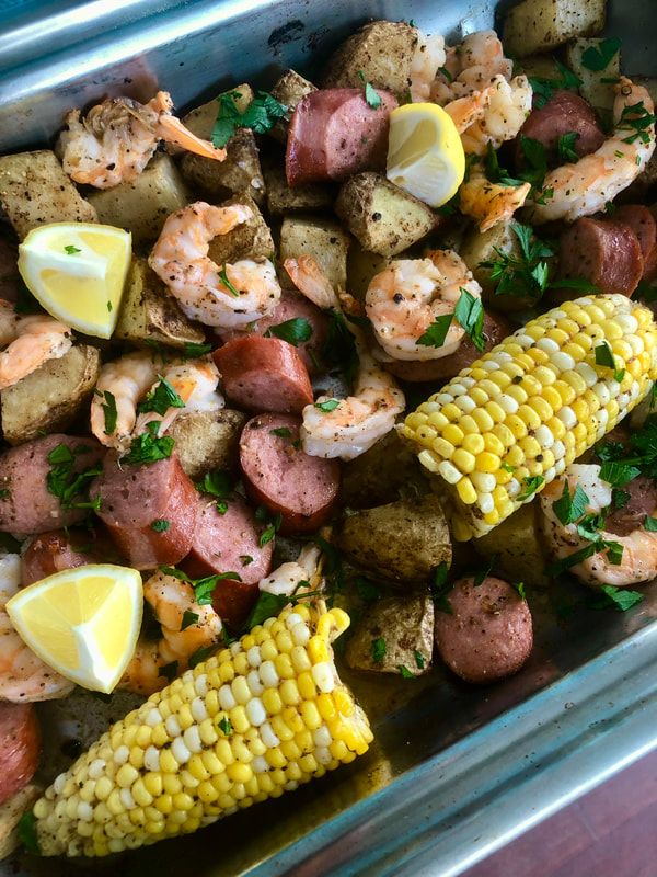 This one pan meal was scrumptious. Everything was cooked perfectly and the seasoning was spot on. I made this a few weeks ago for my husband as I had purchased shell on shrimp at O’Neal’s’ Sea Harvest in Wanchese, NC while on the Outer Banks. The price for fresh shrimp when purchased in bulk (I purchased15 pounds that I shared with our two children and their families), was less than $9/lb. My boil was just as wonderful as my sister-in-law’s. This is the perfect summer party meal for those who enjoy shrimp.