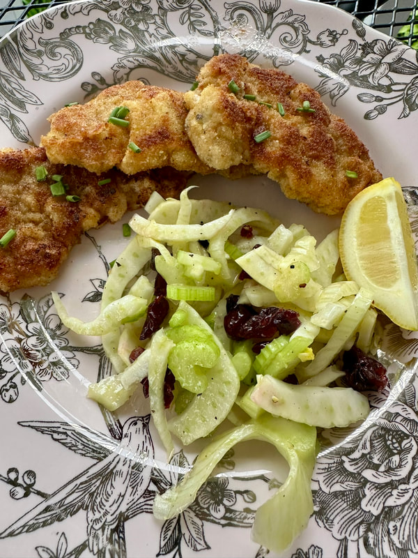 I find pork tenderloin to be an adaptable protein with whichever ingredients you pair it. Last year I found a recipe in “Southern Living Magazine” for Pork Tenderloin Schnitzel with Fennel Slaw. Crispy cutlets that are pounded thin and fried until crispy, sounded good to me. The accompanying slaw made with extra virgin olive oil, apple cider vinegar, lemon juice, honey, kosher salt, black pepper, thinly sliced fennel and celery mixed with sweetened dried cranberries sounded both delicious and appealing.