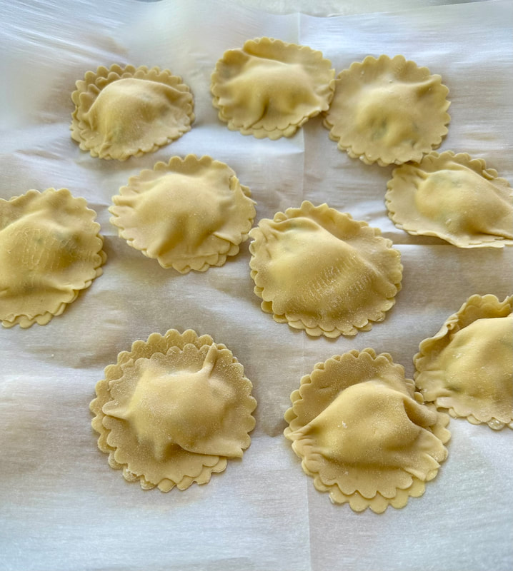 Also, I recently posted an image of raviolis I made using Marcella Hazan’s pasta dough recipe. I’d be happy to share the recipe for those who want it, I doubt anyone will be making pasta during the warm summer months. However, as I recently rediscovered my pasta machine, I felt inclined to try making raviolis. I must say it was getting a bit frustrating as the dough occasionally got hung up around the rollers. However, once I got through those difficulties, I managed to make a small batch. I tried using my ravioli cutter, but had a problem getting a clean cut. I switched to a fluted biscuit cutter and had better success.
